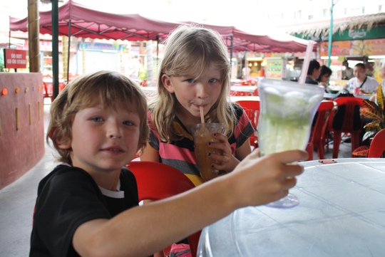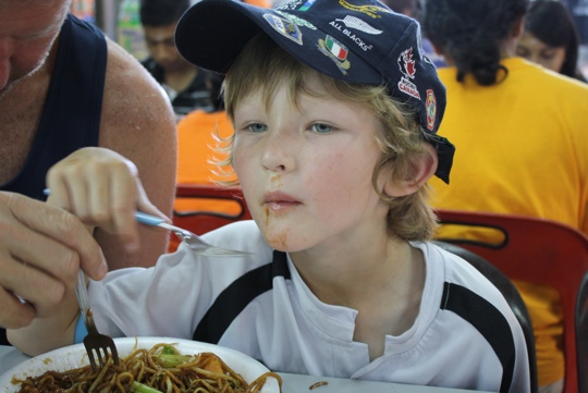 Alas before it could arrive, Christian (6), who had been complaining on and off of a sore tummy all day announced loudly, “I’m going to vomit.” I scooped him up and tried to run, as fast as I could while carrying a 6-year-old, to the nearest exit. We nearly made it. We got as far as a stall next to the exit where Chrisitan proved to be a man of his word into what, I hope, was a rubbish bin and not a bin holding mise-en-place for the frog porridge. We didn’t hang around to find out. While Kennedy and Murray ate I took Christian back to the guesthouse. It wasn’t until the next day we found out why his tummy was sore.