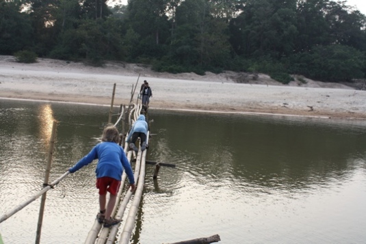 The tuk tuk dropped us beside a wide river. The village we were heading to was on the other side. To get there we needed to traverse a treacherous bamboo ‘bridge’. Entertaining I’m sure for the locals to watch us ‘Falang’ (westerners) tottering over while the locals skip across with ease.