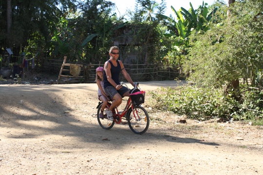 More hammock time this morning. As I catch up on some Internet time, Kenny is lying in a sunny spot on the balcony and the boys have gone off to kick Christian’s Takraw ball around. After a lazy breakfast, we hired two bikes ($1.50 for the day) and headed off with one child on the back of each. We cycled to the other end of Don Det crossing a bridge to enter a national park. We checked out the local Wat then the local waterfall and had a swim. Lunch followed then the race was on to get back for a cold shower and back into the hammock, the circle of the day complete.