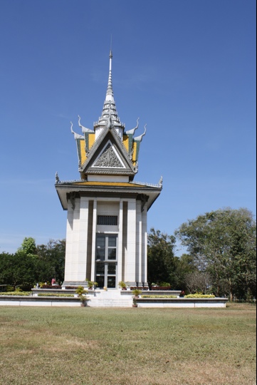From there we went to the Choeung Ek killing fields, one of 300 such places throughout Cambodia. We had an excellent audio tour that described in horrific detail how the Khmer Rouge murdered innocent people. Still visible today in the ground are fragments of bone and teeth and victims’ clothing rising up through the dry earth. The memorial Stupa holds hundreds of skulls many of which are visibly damaged from their death.