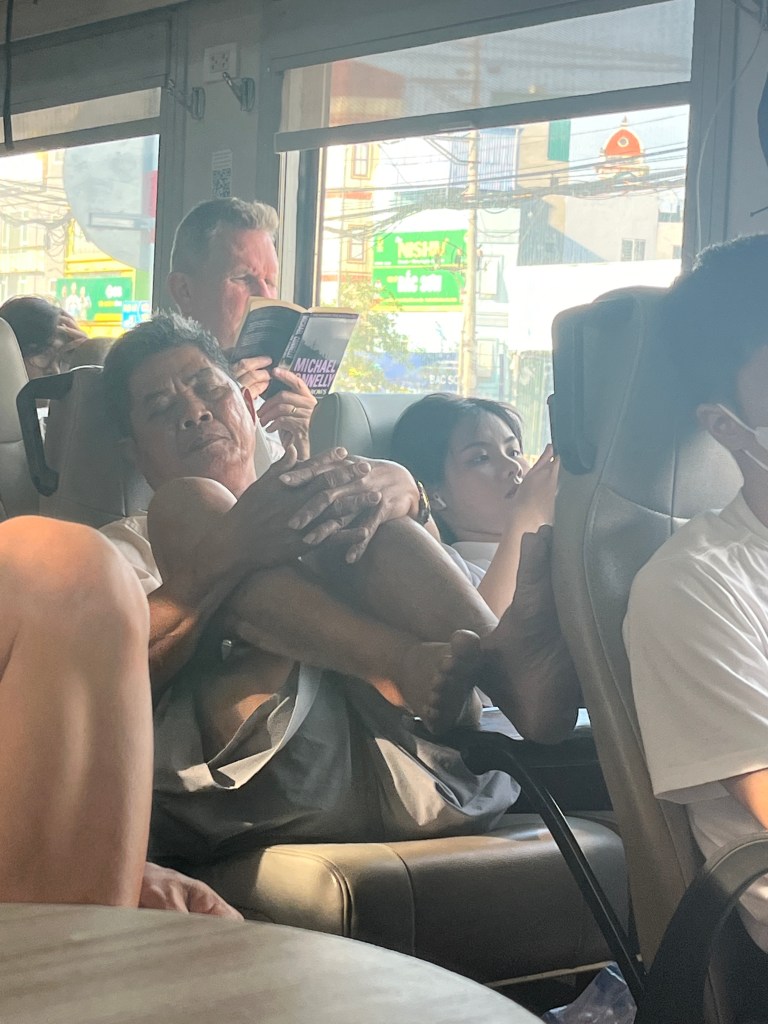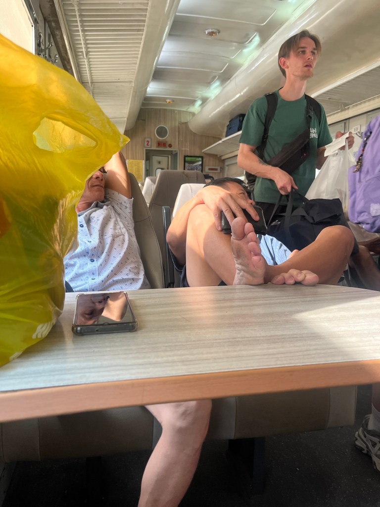 It’s always a little nerve-wracking when you buy travel tickets for foreign lands online but Baolau.com came through with their promise and the tickets I’d purchased, and printed off at home were met with the approval of the train gatekeeper and we were allowed in to coach 2, seats 31 and 32. Murray quickly found that his seat was broken and wouldn’t stay upright. He hedged his bets by standing and hovering near empty seats waiting to pounce the moment the train was departing and it became obvious there would be no one needing them. I meanwhile stayed in my assigned seat facing a man with his filthy feet on the table between our rows, across the aisle another pair of filthy soles on a table was in my eye line and behind me a young child whose parents thought it was a great idea to give her a party blower for the journey. I thought showing your feet was the height of disrespect in Vietnam and having a party horn on public transport should be universally banned. The air conditioning which had been chilling the coach nicely when we boarded had also been turned off and with 5 minutes to go until we pulled out I was losing my rag. Calming breaths, cool air returning and the excitement of the journey getting underway lifted my mood as we rolled down Train Street sending shopkeepers and tourists scuttling out of our way. This alone made the $7.50 train trip worthwhile.