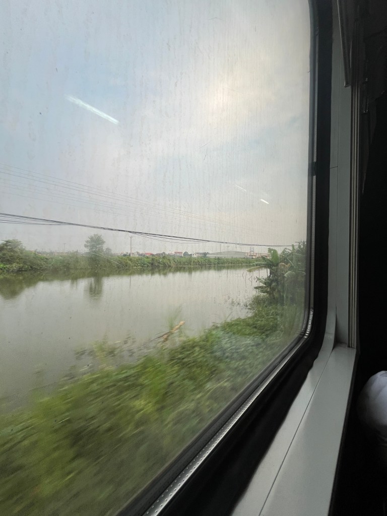 At the first stop, an elderly man got on carrying an extraordinary amount of luggage in a duffle bag, box and a huge sack. Seeing him struggle to find homes for his belongings in the packed overhead luggage racks I offered him up our two seats and I moved to sit next to Murray (and away from the child still enthusiastically blowing her party horn). The ticket-man was having none of it and ordered the man back to his original seat before setting his sights on us. He pointed at us, then at our assigned seats. Murray tried to indicate with his hand that the seat was broken. Ticket-man deepened his frown and again pointed at us and then our seats. We started explaining that the seat was broken and that I was ready to murder a child. Thankfully at this point he gave up, gifted us with a death stare as he hurried up the aisle to harass someone else. There was something interesting to look at through the grubby train windows the entire journey and if the view wasn’t exciting enough train seat roulette kept the journey exciting. At both of the stops train SE5 made between Hanoi and Ninh Binh people got off to be replaced by new people whose seats we could be sitting in.