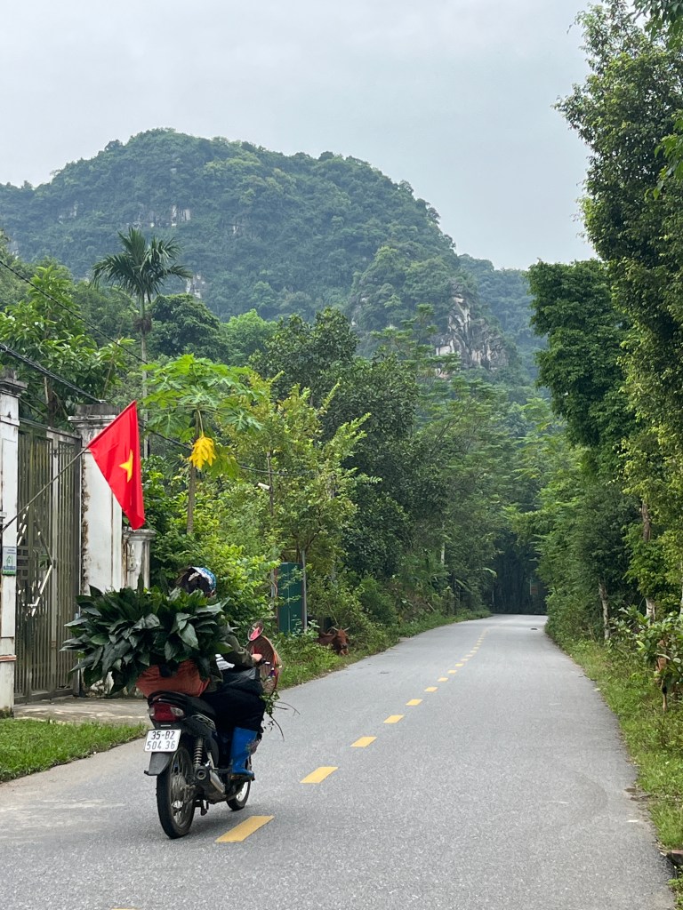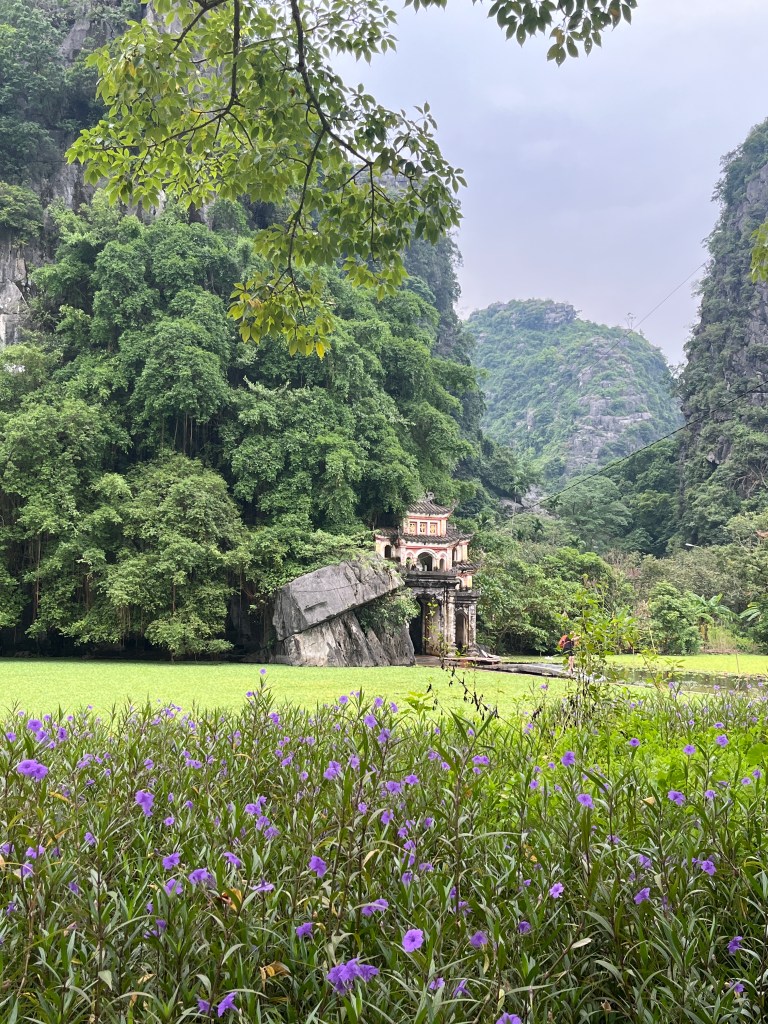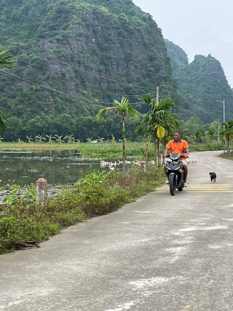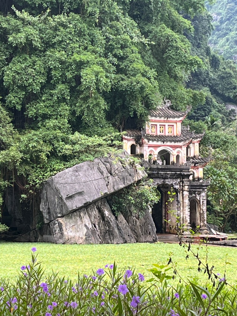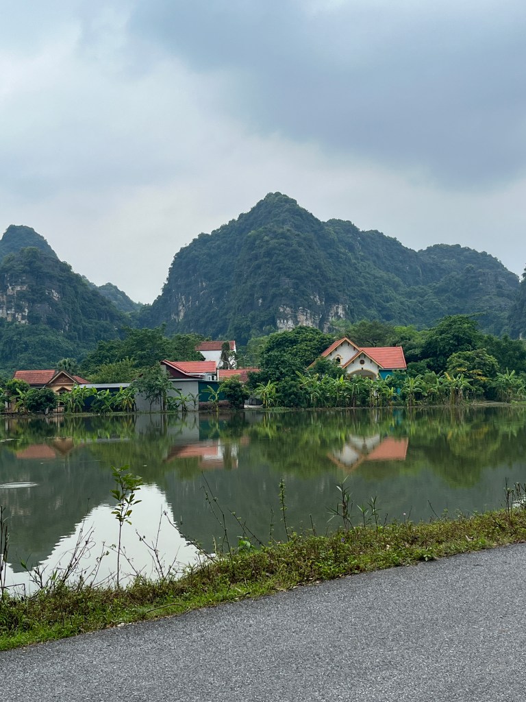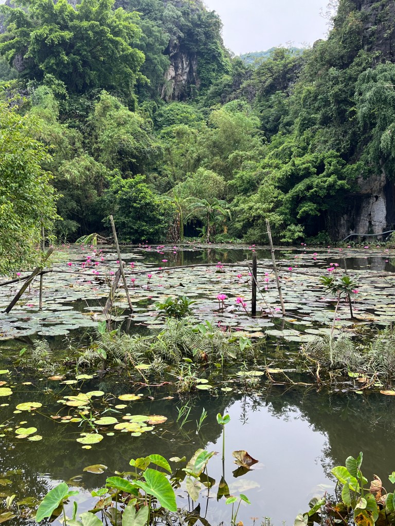 Riding a bike through the countryside was exactly what I hoped to experience in my time here. As soon as I was out of the village traffic was sparse and everyone coming up behind you toots so you know they are there. The road runs between flooded fields and lotus ponds on each side with the still water, more than usual due to the recent typhoon, mirrors the eerie towering mountains dotted around. I can see why the area is known as ‘Halong Bay on land’. During my first 3km cycling the flat countryside, I inadvertently got caught up herding goats and then cattle as I made my way to Bích Động, a temple complex built in 1428.
