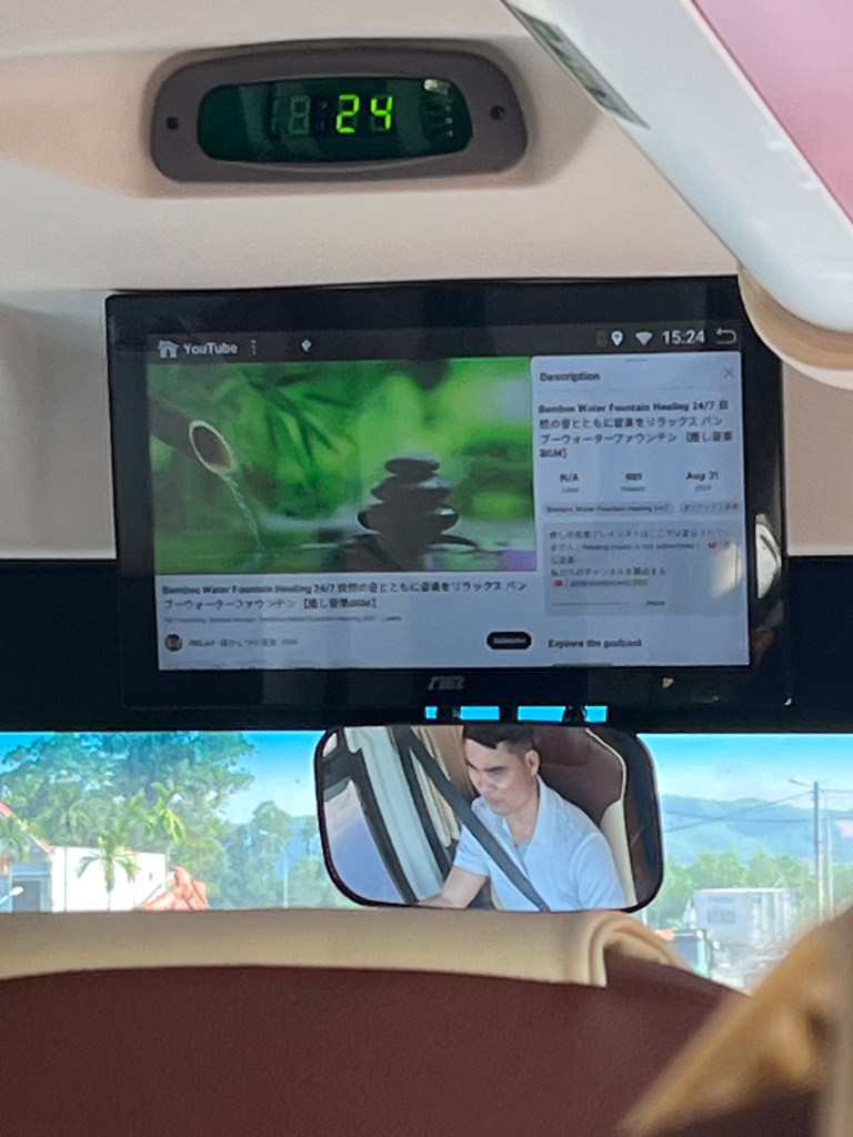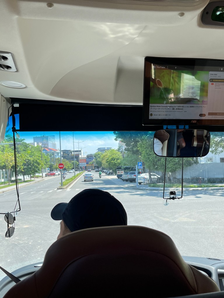 At 1.20 pm our bus arrived, we were ushered aboard, instructed to sit directly behind the driver, and each handed a bottle of icy water. After the handful of other passengers boarded we set off with a driver and what turned out to be, another driver. The driver who was driving fiddled with controls as we left the city and turned on a YouTube playlist of ‘Bamboo Water Fountain Healing’ music, more suitable for a spa but he was maybe trying to put us to sleep. We sat back and initially enjoyed the panoramic view out the front window. Once we were out of the city we started traversing the countryside on mostly one-lane highways. The highways had no passing lanes and only one centre-line colour, yellow. The yellow line was mostly continuous, but occasionally it turned into a broken line, seemingly indicating this was a safer area to overtake. I very quickly decided that a panoramic view of the driver, the vehicles he was overtaking and the oncoming traffic was most definitely what I did NOT want. If I was going to die in a bus crash in Vietnam I didn’t want to see it coming, so I moved a few rows back, stared out the side window at the scenery and worked on settling my nervous system, attempting to sleep or tracking our progress on the map and counting down the minutes until we were due to arrive in Hội An.