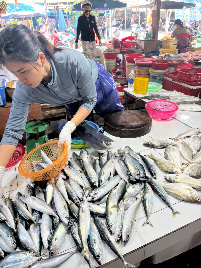 Travelling on two wheels was a lot less scary than it looked. Traffic moves slowly, Ha explained, as the roads are narrow. Waiting for the group to join us in the markets I got to ask my host, and her trainee, a few questions. My most pressing was why they wear long sleeves and long-legged pants all the time when it’s so hot and humid. Ha explained that it is because sunblock is expensive. She can buy a long-sleeved shirt for a few dollars that will last for a year, the same investment in sunblock lasts a week.