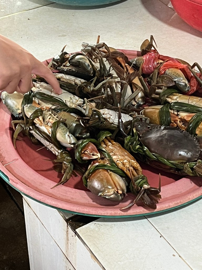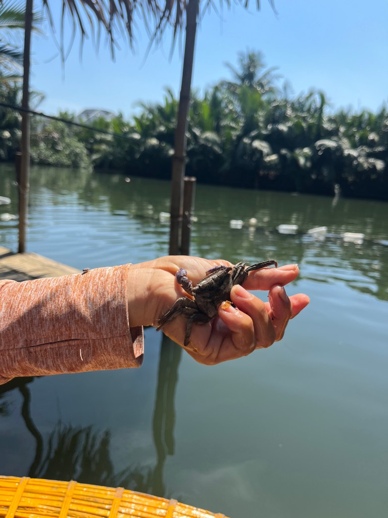 These look nothing like actual boats. The story goes that when the French levied taxes on boats in Vietnam fishermen couldn’t afford to pay them, so they designed circular woven baskets that also happened to float and be able to move with an oar. Today though they seemed primarily be used to try and make the tourists feed the fish by spinning them around quickly as ‘Gangnam Style’ blasted loudly. My Korean friend was not impressed. After the karaoke/dance party finished we were paddled downstream to a small jetty where we fished for crabs. A piece of bait was tied on the end of a thin line attached to the end of a piece of bamboo and dangled on the rocky foreshore. Once a crab knabbed the line with its pincer it had to be carefully lifted into a waiting bucket. The biggest crab was caught by my basket captain who stuck her hand down a jetty pole coming back with a big crab who tried to eat her. I’m guessing she got her revenge later.