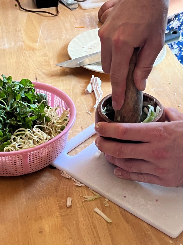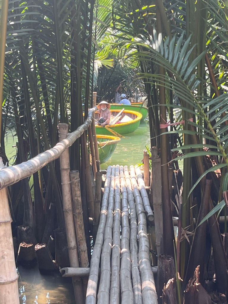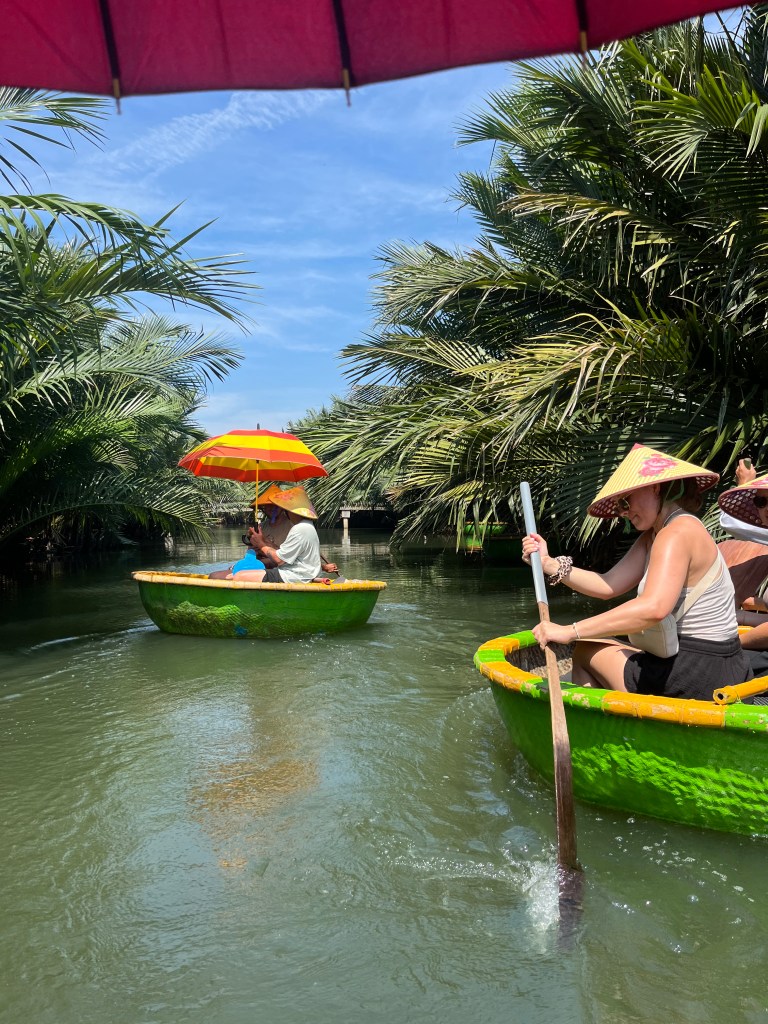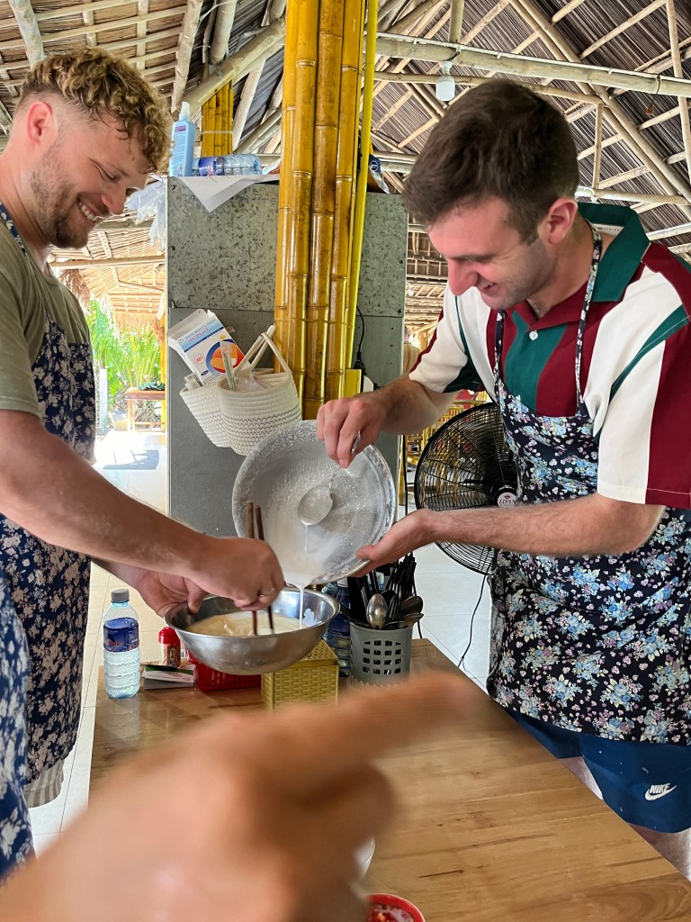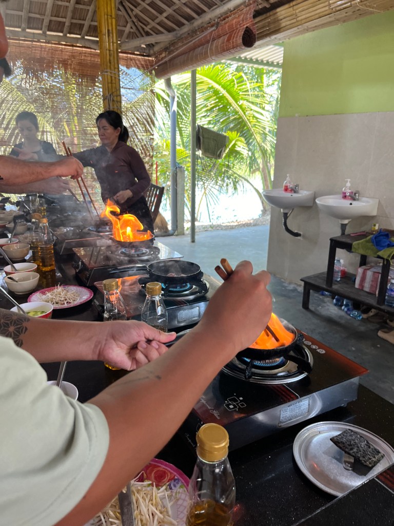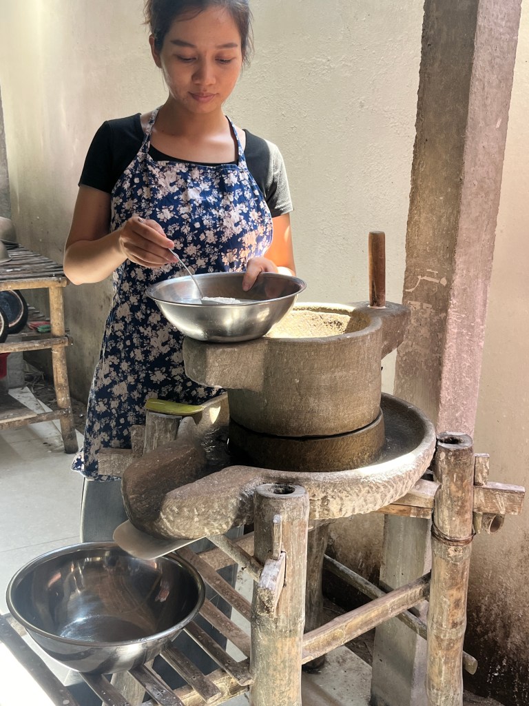 After a bit more paddling we disembarked at a bamboo jetty by Mr Cu’s house. Here Ha and her assistant guided us through making rice milk, using a traditional mill to turn rice into a liquid we then used to make traditional pancakes, which we cooked on small gas burners. We all sliced, diced and grated ingredients to marinate chicken pieces for a stir fry, cats ear mushrooms, taro, spring onions and more to make a spring roll mixture, and then papaya, onion, banana flower and other fresh ingredients for a salad. After cooking, and eating, all our delicacies we were rolled out of the minivan and into our accommodation. https://hoianvillageexperience.com/