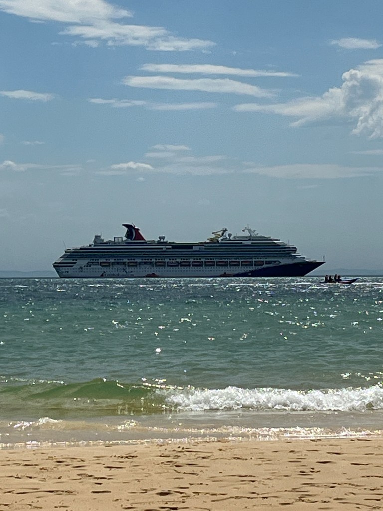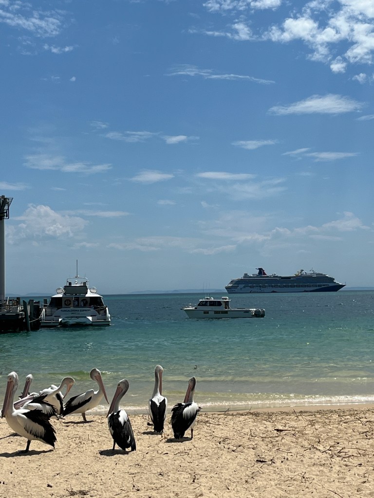The cruise had a day at sea, a day anchored off Moreton Island, followed by another day at sea. We didn’t book any excursions for Moreton Island’s Tangalooma Resort. I had looked before the cruise at the cost of hiring a paddle board which for an hour was $39, the cost of booking the same on the day the ship was there was more than double. As it turned out it was less than ideal conditions for paddle boarding but watching learners try did provide for entertainment as we took a refreshing dip in the choppy sea.
